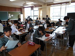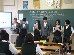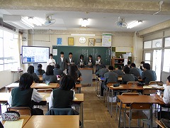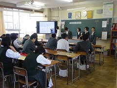 今日は、半日学校公開。朝から2時間の授業参観と、PTA総会、進路説明会(保護者会)と忙しい1日でした。1校時の参観は、道徳の授業。しっかり考えて、熱心に発表する姿が、どの教室でも印象的でした。2校時は、1・2年生は教科の授業、3年生は各学級、総合的な学習の時間で、先日の進路体験学習の成果を各班で発表するという内容でした。大型テレビを活用しながら、わかりやすく発表していました。
