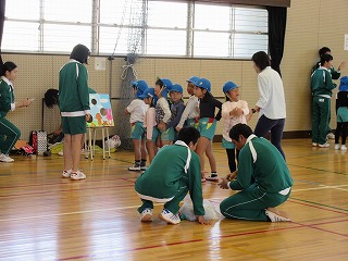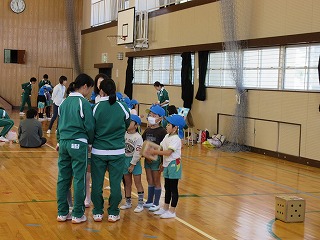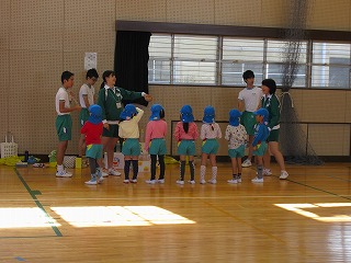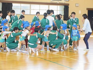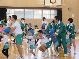 生徒の家庭で、幼稚園の兄弟がいるお家はあまりないと思います。最初は、少し硬い表情で戸惑っていた生徒も、ゲームをする中で、どんどんとやわらかい表情になり、園児・生徒とも楽しそうで、この取組を行ってよかったなと感じました。草内幼稚園の皆さん。ありがとうございました。