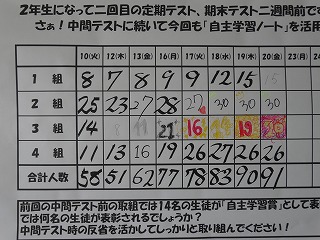 今週の木曜日から期末テストです。部活動停止中、放課後、学習会に残っている生徒もいます。2年生の、家庭での自主学習もテストを前にして、取り組む生徒が増えました。まだ、学習モードになっていない人も、気を入れなおして勉強に励んでください。