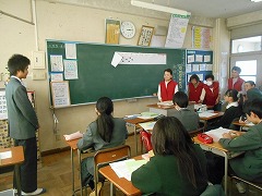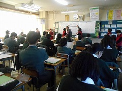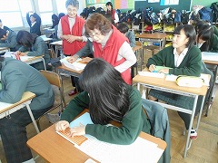 教えていただいたのは、点字サークル「すみれ」の皆様です。1クラスに7人以上、入っていただき、点字の構造を教えていただいた後、生徒がそれぞれ自分の名前を点字で書いたりするのを、丁寧に教えていただきました。