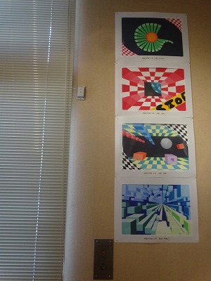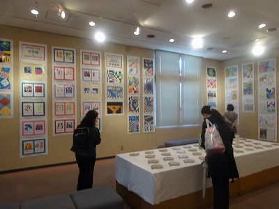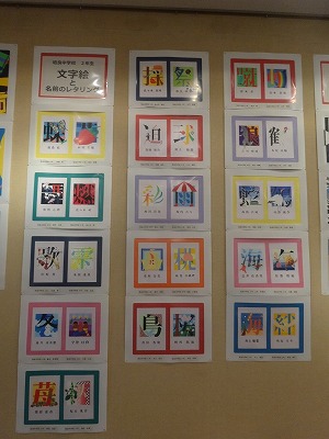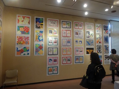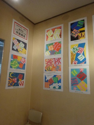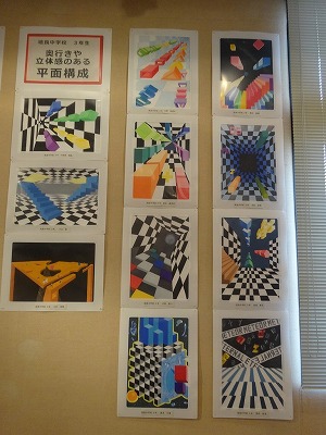 本校からは、1年生「漢字を使った平面構成」10点、2年生「文字絵と名前のレタリング」30点、3年生「奥行きや立体感のある平面構成」15点の、計55名分が展示されています。展示された生徒諸君には、今日、保護者の方向けの案内をお渡ししています。ぜひ、図書館を訪れの際には、美術展をご覧いただき、中学生の現代的なセンスあふれる作品をお楽しみください。
