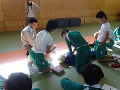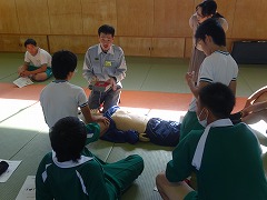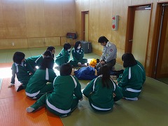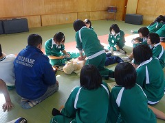11日より3日間、各学級2時間ずつ、柔道場で救命救急の実習を行いました。京田辺市の消防署から講師をお招きして、各グループごとに人形を使って丁寧に教えてくださいました。実際にそのような場面に出くわした時、どこまでできるか難しいですが、その場に居合わせた人が協力し、分担して、連絡や心臓マッサージなどを手際よく行うことが大切だとわかりました。消防署の皆様、丁寧なご指導ありがとうございました。