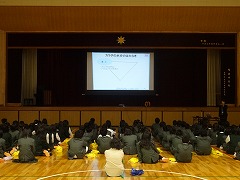 1年生は6校時、体育館で熱中症予防教室を行いました。本格的に暑くなる季節を前に、水分補給の大切さを学んで、自分で水分や塩分をしっかりと補給できるようにすることが目的です。大塚製薬から講師を迎え、わかりやすく説明していただきました。ありがとうございました。