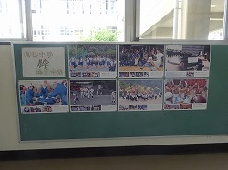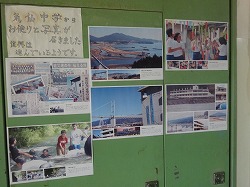 気仙中の生徒の皆さんが頑張っている様子がよく分かるパネルです。気仙中の校舎自体は、津波の被害で使えなくなり、今は、山間部にある廃校になった中学校の校舎を利用しています。生徒の自宅もほとんどが津波被害にあい、生徒の多くがあちこちの仮設住宅からスクールバスに乗って学校に来ます。そのような中で、短い時間や限られた空間を活かして、部活動をがんばり、多くの成果をあげたり、3年生全員が英検3級を取得したりと、培良中も頑張らなければと思わせる努力のあとがたくさんありました。また、もともと海沿いで育った生徒たちが、山間部の清流で水遊びをしている写真には、つかの間の安らぎを感じるとともに、陸前高田市の一日も早い復興を願わずにはいられません。