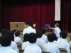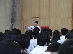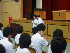 5・6校時の2時間をとって、「友達関係、いじめ、いじり、ネットいじめ」について考える機会を持ちました。お話をしていただいたのは、佛教大学教授の原清治先生です。非常に暑い体育館の中で、正味90分、手振りや動作も入れながら、エネルギッシュにお話をしていただきました。その熱意を感じてか、全校340名が、90分の間、集中力を切らさず、静かに話を聴き、中には、挙手して自分の意見や考えを述べる生徒もいました。
