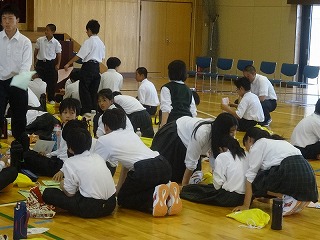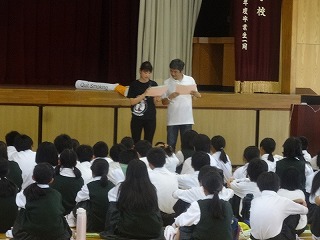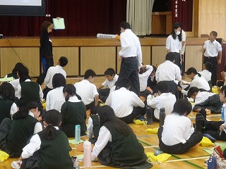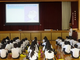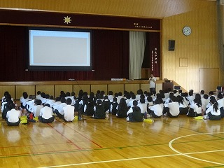 1年生は、5・6校時、体育館で喫煙防止教室を行いました。担当していただいたのは、医師の土井先生とNPO「たばこフリー」の皆様、市の保健師、日赤の看護学校の皆様です。