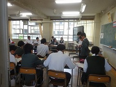 1校時は、3学年とも、普通の授業参観。2校時は、3年生は、各学級で班ごとに進路体験学習のまとめ発表会、2年生は、班ごとに職場体験のまとめ発表会、1年生は授業の参観。3校時は、学校薬剤師の山崎先生に、薬物乱用防止教室をしていただきました。さらにその後、PTA総会という盛りだくさんの内容でした。