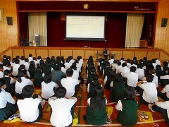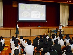 2年生は6校時、体育館で食育の学習を行いました。講師は京田辺市の栄養士、桐村先生です。スライドを使いながら、エビイモや田辺ナスなどの京田辺市特産の農産物や郷土料理などをわかりやすく紹介していただきました。また、それらの作物を作られる農家の苦労や喜びなどを聞いて、改めて食べることに感謝の気持ちをいだきました。