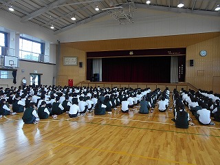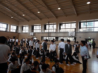 生徒は、本番を想定して、整然と避難しました。避難指示から、体育館に全員が並んで点呼が終了するまで3分4秒。新記録でした。