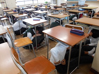 警報で全員机の下へ避難 体育館へ学級ごとに避難