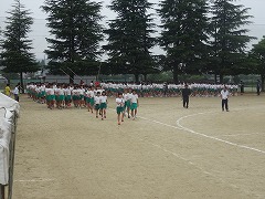 体育大会の予行、午後からは雨がきつくなるという予報も出ていたので、急きょ、3・4校時に予行を行いました。しかし、行進が始まる前から雨がぱらつきだし、行進の最中に本降りとなってきました。残念ながら開会式等の予行は、今日は行うことができませんでした。雨の中、少しでも早く終われるように、みんなも素早く行動できました。