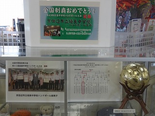 市役所を入ったすぐのロビーに、培良中ハンドボール部男子の全国優勝を記念した展示コーナーを作っていただいてます。全員の写真と勝ち上がり表、メンバー全員のサインボールが展示されています。用事で市役所を訪れた時には、ぜひご覧ください。