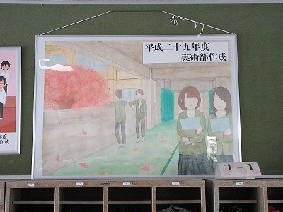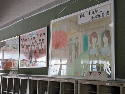 今年も美術部の合同作品が完成し、昇降口に展示されました。今年度は渡り廊下で談笑している様子ですが、制服の色等に相当工夫がされています。いい色が出ています。ご来校の折にはぜひご覧ください。美術部の皆さん、ご苦労様でした。