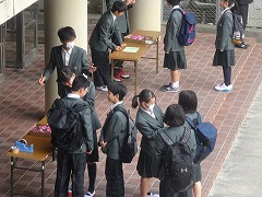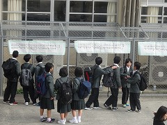 初登校 学級を確認します。 生徒会の先輩にコサージュをつけてもらいます。
