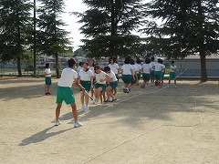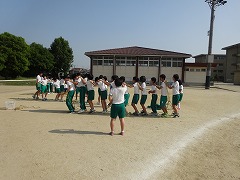 今日から体育大会の練習が始まりました。5月とは思えない暑い日でしたが、どの色も3年生を中心に1・2年生に指示を出して、グランドで、大縄跳び、ムカデ競争、リレーに分かれて練習をしました。まだまだ、ムカデも足がそろわず倒れることも多いし、大縄跳びも、飛べる回数も少ないですが、11日の本番を目指して頑張りましょう。