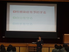 3校時は、山城北保健所から3人の方々を講師に迎え、性に関する学習「幸せな大人になるために」という授業を受けました。主に性感染症予防の話から、性にまつわる様々な話題について学習しました。3人の先生方の説明が非常にわかりやすく、生徒も積極的に参加していました。山城北保健所の皆様、ありがとうございました。