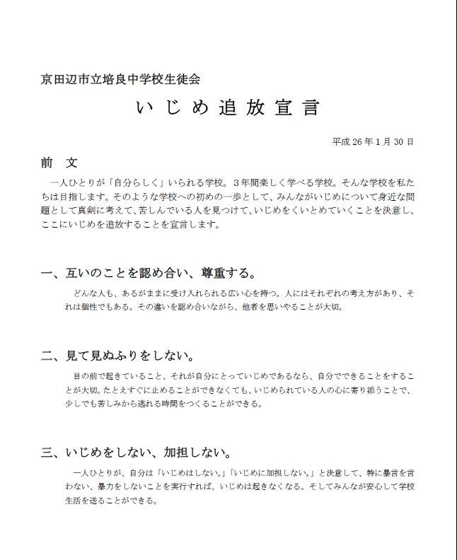 京田辺市立培良中学校では、生徒一人一人の尊厳と人権が尊重される学校づくりを推進することを目的に、全ての生徒が「いじめのない明るく楽しい学校生活」を送ることができるように、京田辺市教育委員会(以下「教育委員会」という。)・家庭その他の関係者の連携の下、いじめ防止対策推進法(平成25年法律第71号。以下「法」という。)第13条の規定に基づき、いじめの防止、いじめの早期発見及びいじめへの対処(以下「いじめの防止等」という。)のための対策を総合的かつ効果的に推進するため、京田辺市立培良中学校いじめ防止基本方針(以下「基本方針」という。) を策定します。