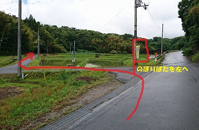 畑の入り口です。のぼり旗を左へ