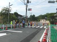 上の2枚の写真は、新たに設置されたガードパイプと歩行者用グリーンゾーンです。工事が完了すると、さらに安全に登校することができます。