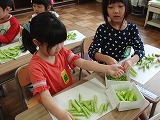 1時間目から1年生が一生懸命にさやから豆を取り出しています。