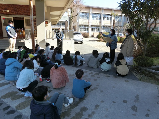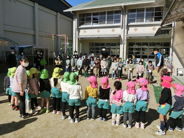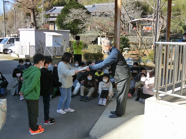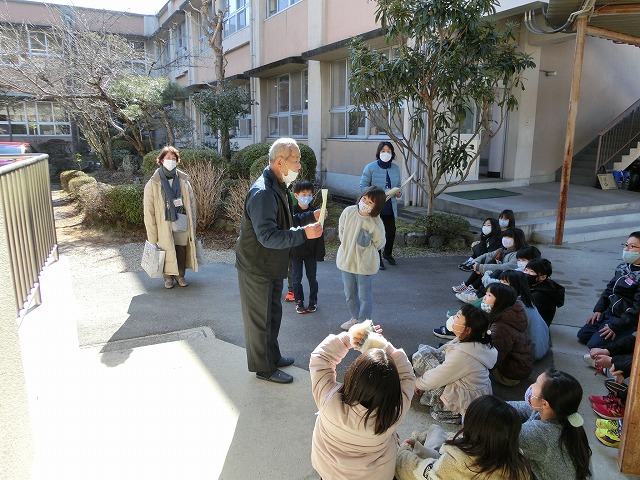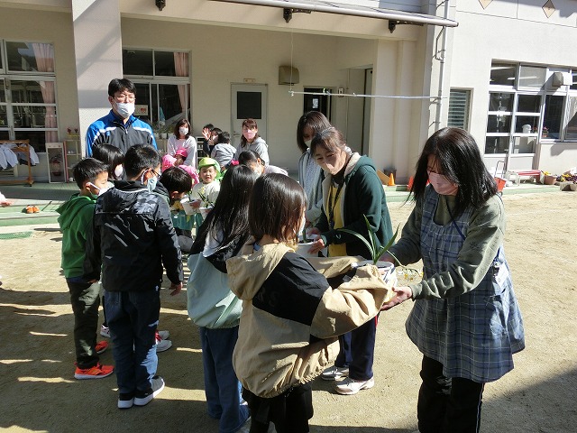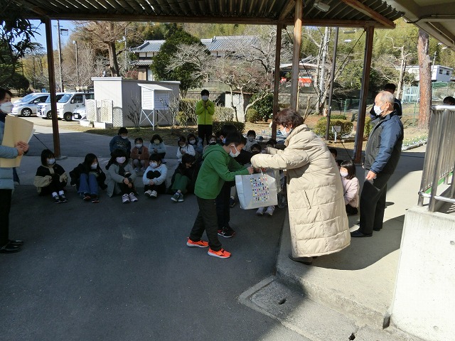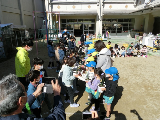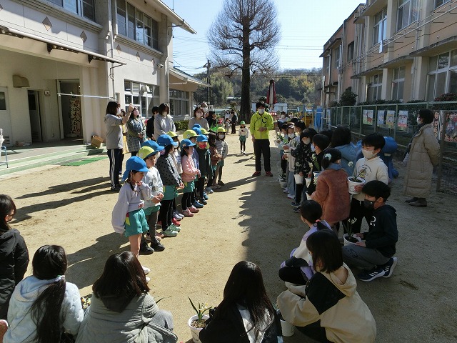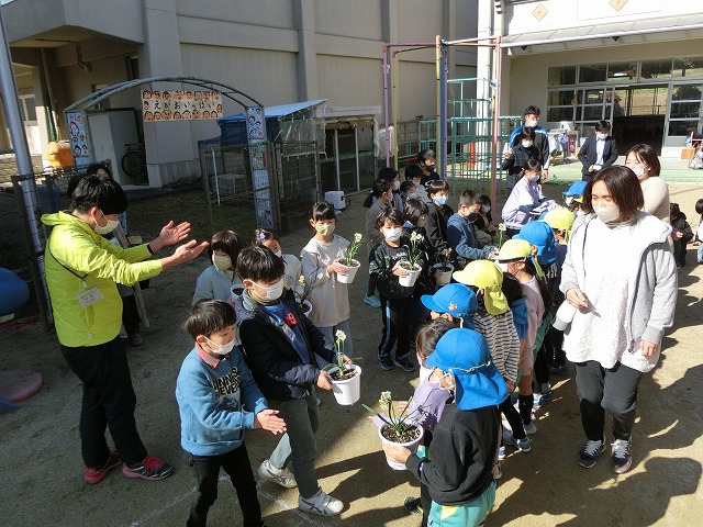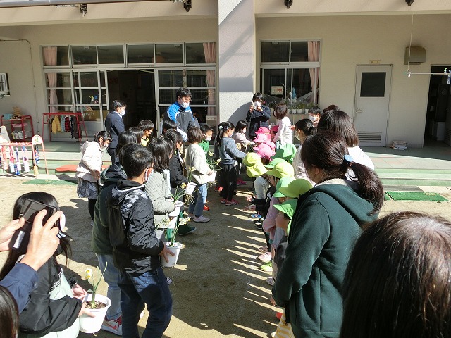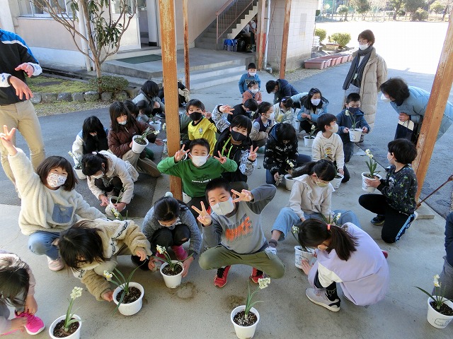 人権擁護委員の方々に来校いただき、感謝状と記念品を贈呈していただきました。昨年10月31日に植え付けを行ったスイセンが大きく成長しており、子どもたちがそれぞれの手にスイセンの花を持って、普賢寺幼稚園・普賢寺児童館にプレゼントとして持って行きました。