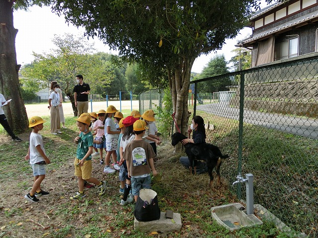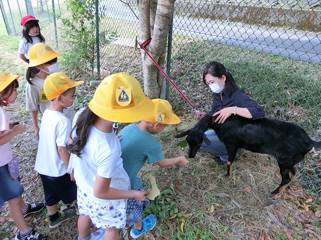 9月14日(火)の2時間目 生活科【生きもの大すき】『生きものにあいにいこう』の時間に、1年生が地域に住むやぎとのふれあい体験をしました。初めて見るやぎに、はじめは近づきにくい子もたくさんいましたが、実際に触ったりえさをあげたりすることで、やぎとの距離が近づきました。