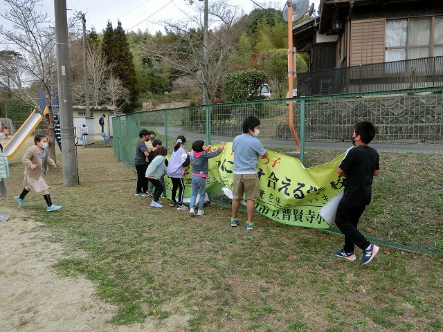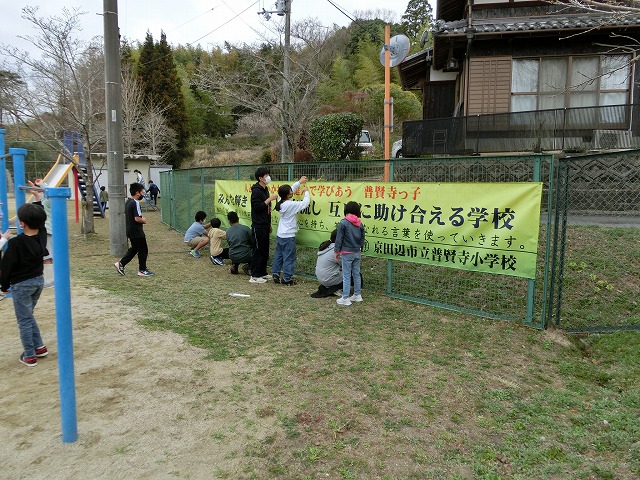 3月17日(金)今日の中間休みに児童会運営委員の人たちに運動場のフェンスに張ってもらいました。普賢寺小学校がもっともっと良い学校になるようみんなで一緒にがんばっていきましょう。