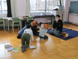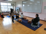 笛や鼓の説明を聞いたあと、子どもたちも直接、鼓や太鼓をたたかせていただきました。見るたけ、聞くだけの体験だけではなく、直接体験をさせていただき、子どもたちはおどろいたり、笛も吹かせてほしいなど、興味津々な様子でした。