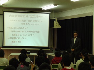 1月15日(水)の3・4時間目に京都大学防災研究所教授の飯尾能久(いいお よしひさ)先生による特別授業「知的好奇心をくすぐる授業『地震はどうして起こるのか』」が行われ、4年生以上の児童が参加しました。