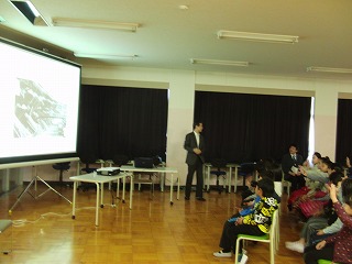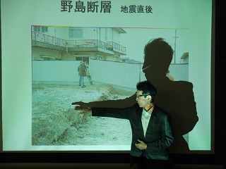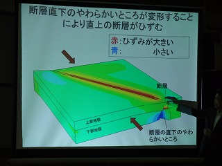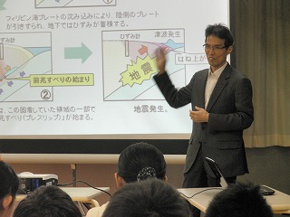 授業は写真やイラスト、アニメーションを使って、地震がどんなものか、内陸地震が起こるわけ、地震の予知について詳しく丁寧に教えて頂きました。