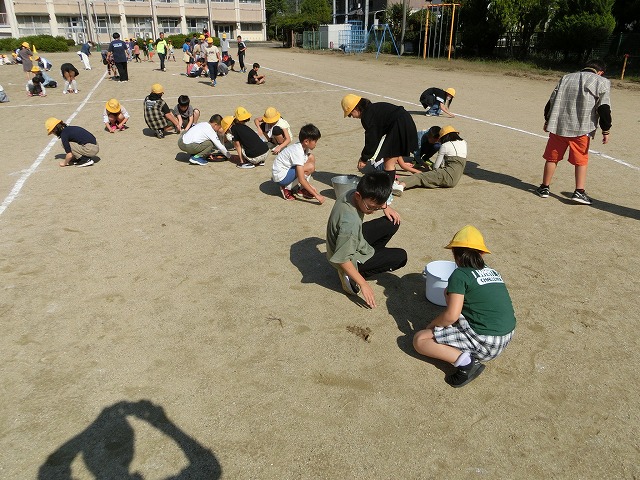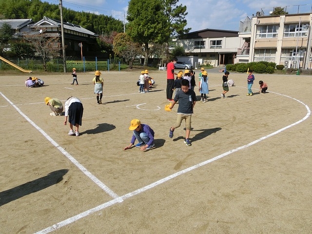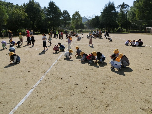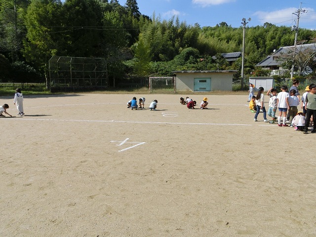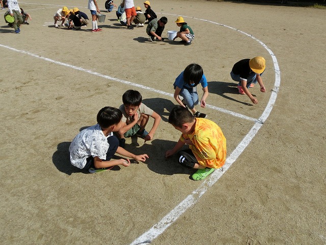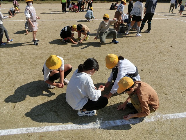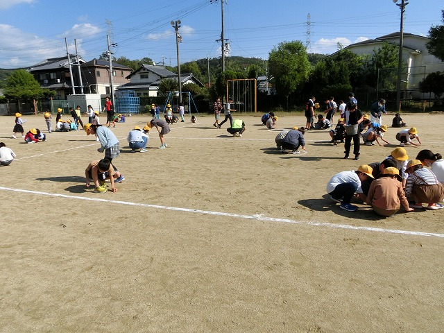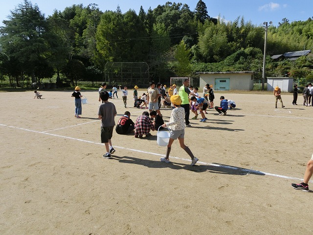 10月16日(月)週末雨が降り、グランドの土がしっとりしているので、今日の掃除時間は全校で運動場の石拾いをしました。明日の運動会全校練習と児童会種目練習に向けて、さらにグランドがきれいになりました。