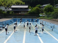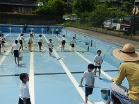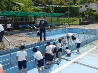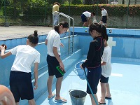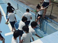 次に、壁面を掃除しました。 最後にプールの底をみんなで並んでていねいにみがきました。これで、もう泳げますね。今年も安全に気をつけて、昨年以上の泳力を身につけましょう。5・6年のみなさん、暑い中ごくろうさまでした。