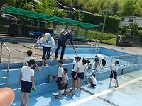 水泳シーズンを前に5・6年生がプール清掃をしました。 最初は、たわしやデッキブラシを使って、プールサイドを掃除しました。