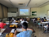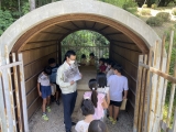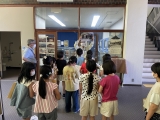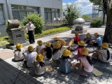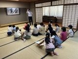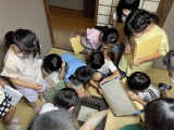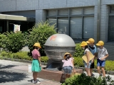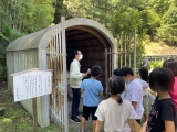 中央公民館の方と、市役所の方に説明してもらいながら、しっかりと見学することができました。中央公民館の和室の中の茶室に興味津々。中央公民館の裏にある石の棺の文化財も見せてもらい、とても熱心に話を聞いていました。