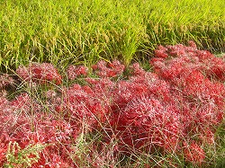 黄金色に染まる田んぼの色と鮮やかな赤の彼岸花です。