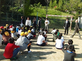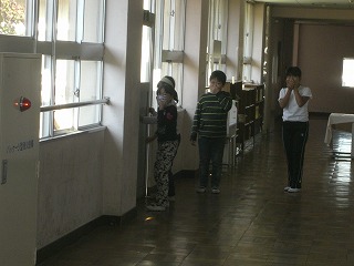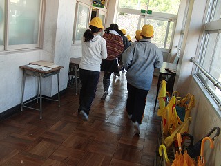 今回の訓練は子どもたちが自由に遊んでいる昼休みに、予告せずに行いました。もちろん、、避難する時に気をつける事は事前に指導しています。