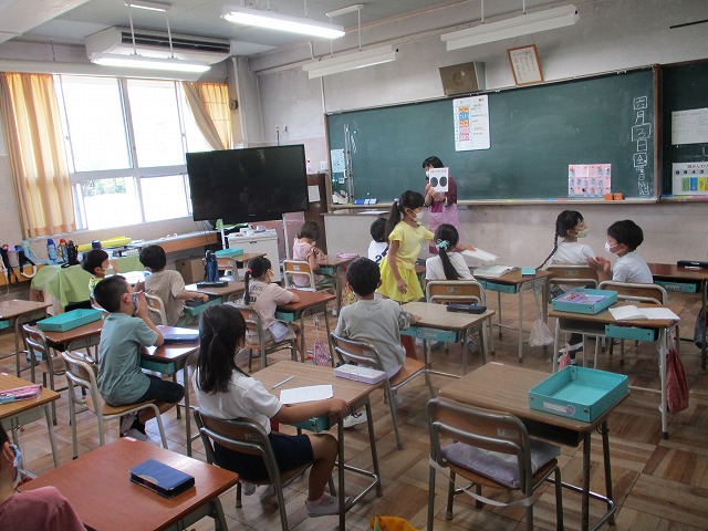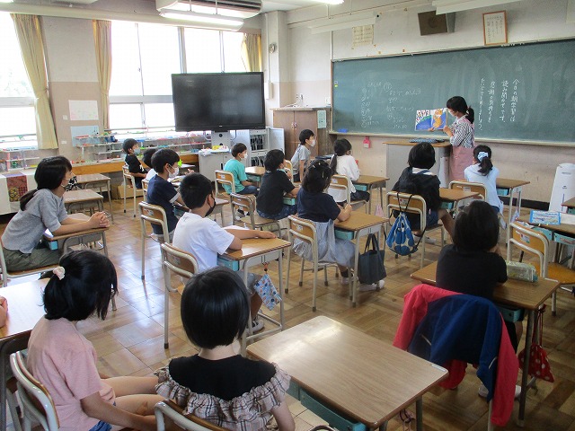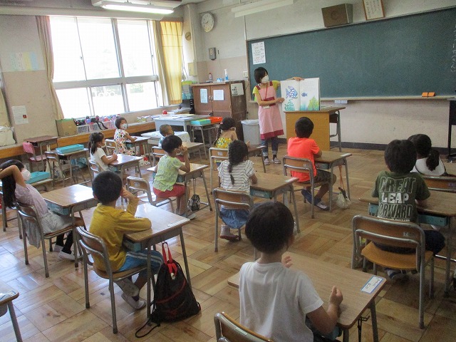 絵本の読み聞かせをしていただきました。毎回、子どもたちは一生懸命聞いています。図書ボランティアのみなさん、ありがとうございました。図書室の本のバーコード貼りもお手伝いいただいています。ありがとうございました。