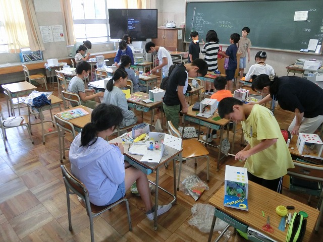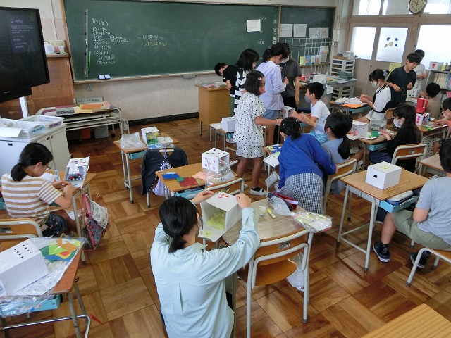 7月6日(木)真剣に考える6年生の横の教室からは、和やかな雰囲気が伝わってきました。5年生が図工で「のぞいてみると」の製作活動に取り組んでいました。色紙や紙粘土などの素材を工夫して使い、自分なりの「お部屋」作りをイメージを膨らましながら楽しんでいました。