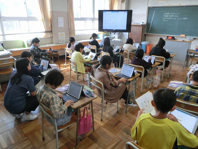 10月25日(水)今日の2時間目に4年生は算数「面積の求め方のくふう」で、歪な四角形の面積を公式を使って求める方法をタブレットを使って考えました。子どもたちはそれぞれ自分の工夫が見て分かるように補助線を引いたり図を拡大したりしながら、考えていました。