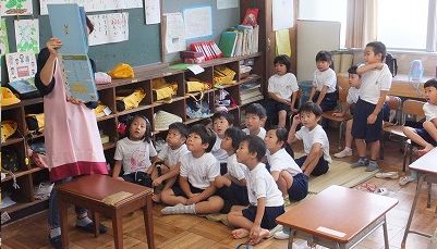 写真は1年生教室の様子です。みんな熱心に聴いています。
