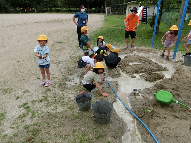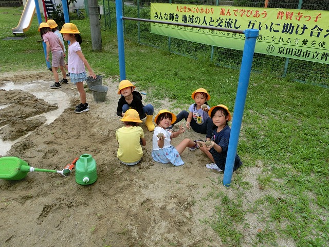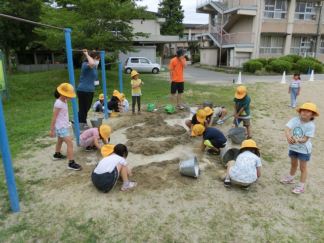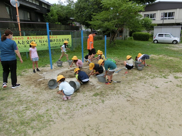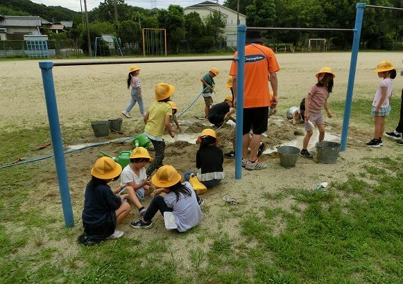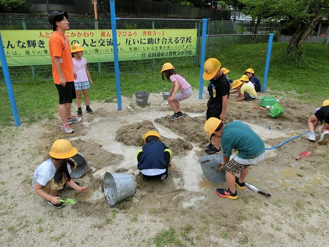 7月5日(水)今日の4時目に1年生が生活科「なつとなかよし」の学習で、水&土&砂&泥遊びをしました。砂場にホースを引っ張ってきて、山を作ったり川を作ったり泥団子を作ったりしながら、水土砂泥遊びを満喫しました。亀井先生の「もうすぐ片づけをするよ」の声も聞こえないぐらい楽しんでいました。
