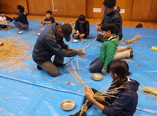 12月18日(月)5年生がしめ縄づくりを行いました。この日は社会人講師の中西稔さんと中冨忠則さんにお世話になって、5年生が正月飾りに使用するしめ縄を稲わらを使って作成しました。子どもたちは稲わらをよりながら、上手にしめ縄を作成していきました。お世話になった皆様ありがとうございました。