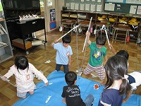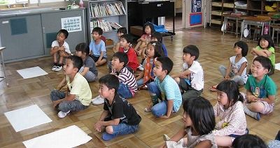 この日登場した学校周辺の生き物は「ダンゴムシ」「クワガタ」「カブトムシ」「バッタ」「テントウムシ」「カタツムリ」「ザリガニ」・・・等々です。1年生も興味深く終始熱心に聴いていました。最後はみんなで楽しく魚釣りをして活動を締めくくりました。