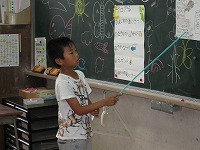 生き物ランドとは、2年生が1年生にいろいろな生き物の体のつくりや特徴、飼育の仕方などを教える授業です。2年生は少し緊張しながらも、指示棒を上手に使いながら、ていねいに説明していきました。
