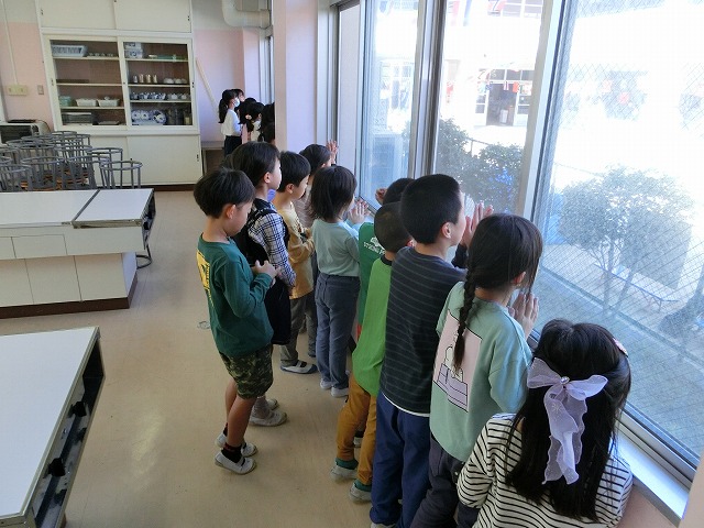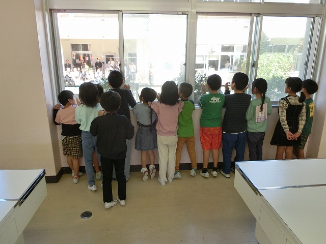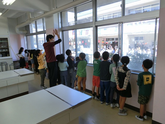 10月12日(木)今日はお隣の普賢寺幼稚園の運動会で、今日の中間休みに子どもたちが家庭科室で参観しました。音楽に合わせて手拍子をしながら、下に妹や弟がいる子はより真剣に応援していました。