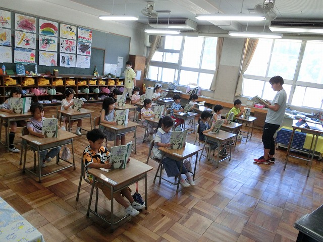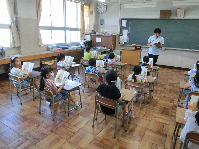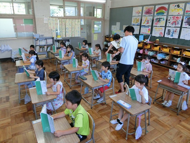 7月4日(火)とっても元気な声に誘われて教室に入ると、1年生が全員で声を揃えて「おむすびころりん」を読んでいました。全員背筋の伸びた良い姿勢で、声も心もそろって読んでいてびっくりしました。