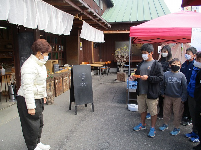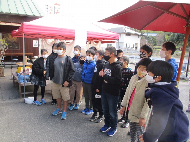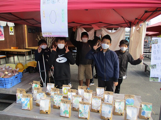 12月1日(木)5年生が普賢寺ふれあいの駅で自分たちが作った米の販売を行いました。この春から、種まき・苗代づくり・田植え・稲刈り・精米など、田んぼの学校の堀江さんを中心にお世話になり、今日の販売の日を迎えました。今日のためにチラシを作り、自分たちでイラストを描いた米袋合計24個を販売しました。