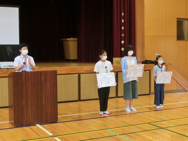 京田辺市平和書道展で入賞した人の表彰をしました。全員で拍手をしてお祝いの気持ちを伝えました。