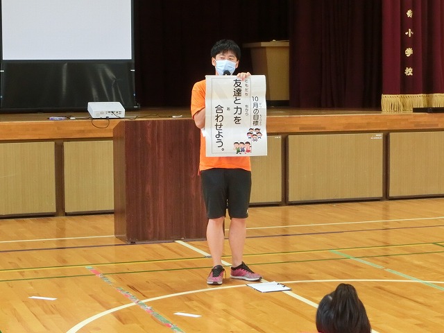 9月28日(水)10月の全校朝礼がありました。2年生、4年生、6年生は体育館、1年生、3年生、5年生は教室からZoomで参加しました。校長先生からはトイレのスリッパの話を聞きました。みんなでスリッパをそろえて気持ち良く生活していきましょう。