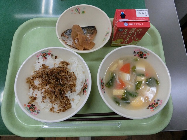 1月26日(木)今日は『エコクッキング1』ということで、ごはん、さばの生姜煮、しろなのみそ汁、だしがらかつおのふりかけという献立でした。『エコクッキング』の献立部分は、今日の「ふりかけ」で、普通は捨ててしまうだしがらを使ったふりかけでした。エコクッキングによって、ゴミとして捨てられてしまう食材は減ります。これからも「もったいない」の精神で、食品ロスを減らしていきましょう。